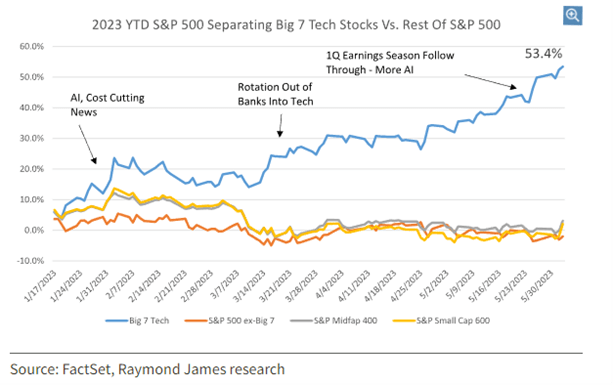 The tech giants have led the market for most of 2023 – the Big 7 of the S&P 500 index have risen +53% for the year versus about 0% for the remaining 493 stocks: