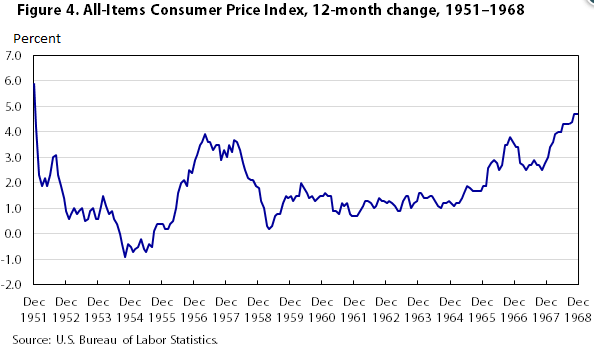 - After peaking at 10 per cent in 1951, inflation stayed below four per cent until 1968, when the next war – Vietnam – heated up.